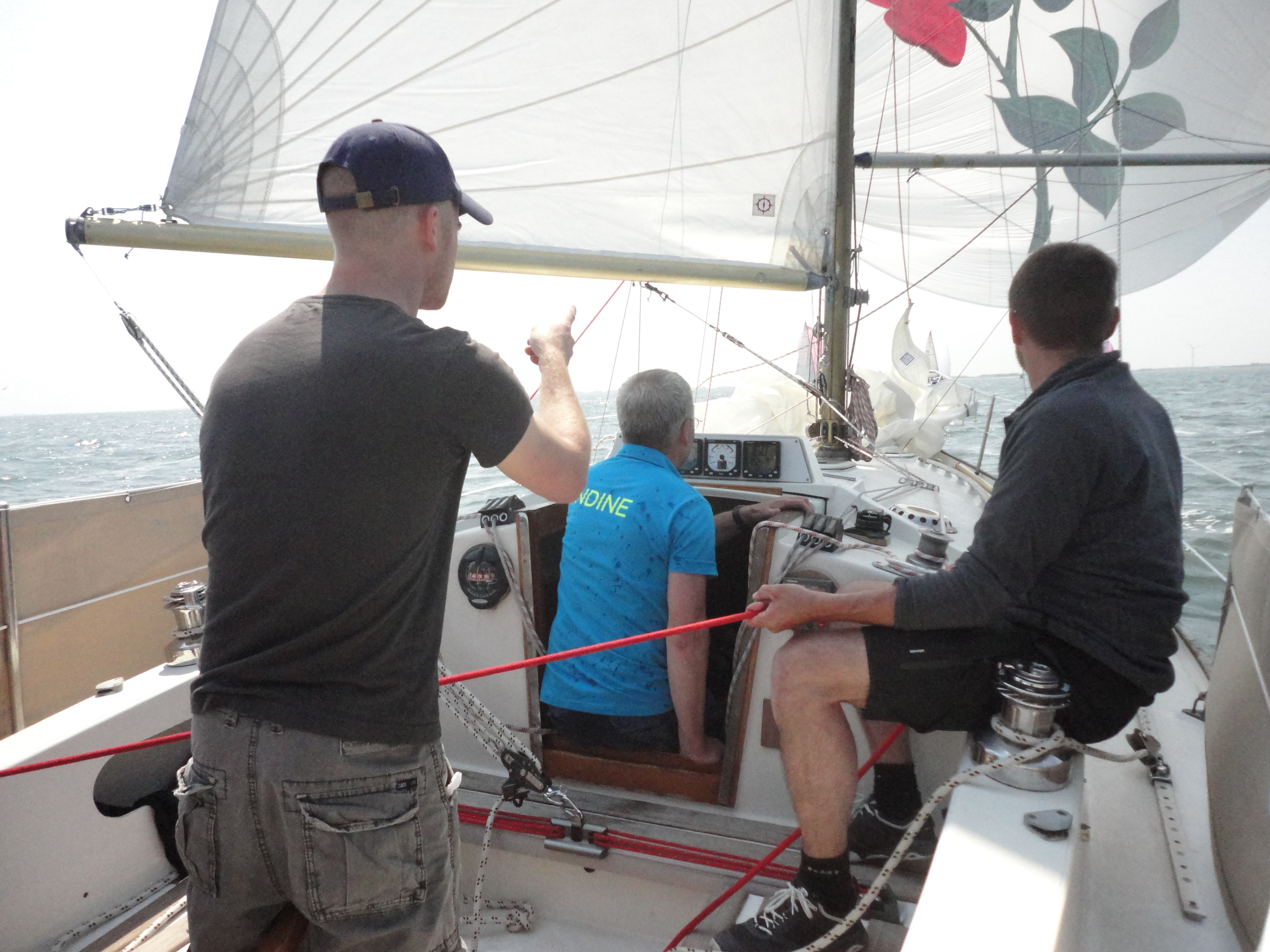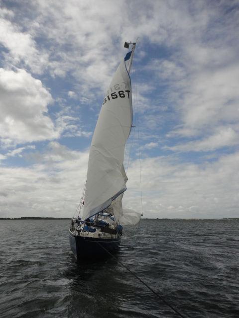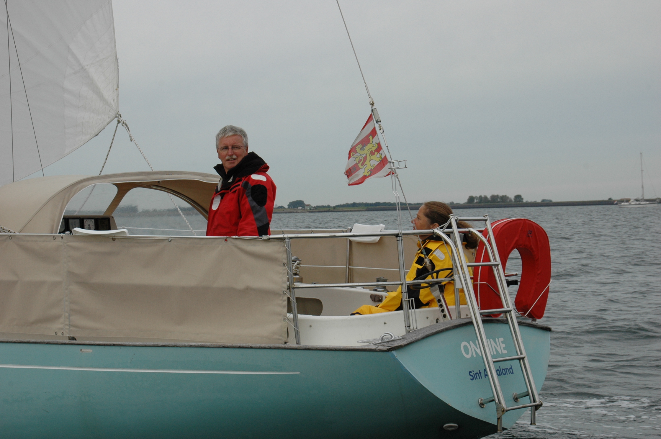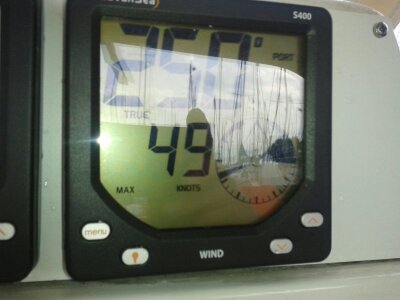 Begin augustus 2012 tijdens de terugtocht van Neeltje Jans naar huis op een gewone rustige zondagmiddag werden we ingehaald door een paar erg donkere wolken. Net voorbei de Zeelandbrug leken ze via Kats om ons heen te trekken, maar plotseling begon het toch wat harder te waaien. We voeren vóór de wind op vol grootzeil en Genua 3 (de kleinste) 15 knopen, 20, 25 …. Het begon hard te regenen, 30, 35…. Het zal toch wel een keer stoppen. We zagen niets meer om ons heen en op goed geluk de Krammer in. De Genua had ik inmiddels uit de wind achter het grootzeil gezet. Later in de haven bleek dat de wind op een gegeven moment opgelopen was tot 49 Knopen! Zo snel ze kwam was het ook weer over en zag je ook weer de andere schepen om ons heen die hetzelfde hadden meegemaakt. Gelukkig geen schade, ook niet bij de andere schepen.