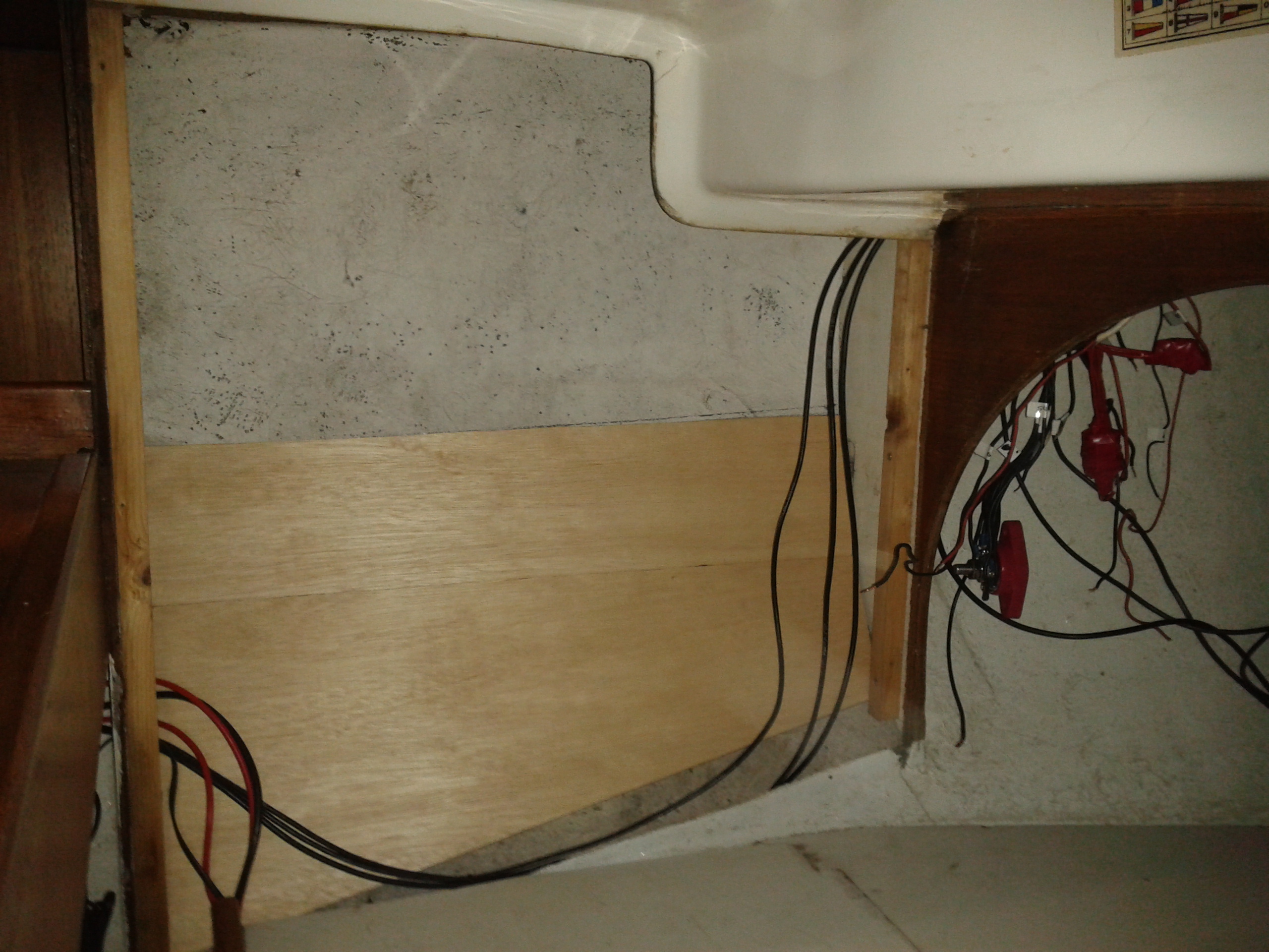 Elektrakast is leeg. Ik wil de gehele achterwand kunnen benutten om de marifoon binnenunit, AIS ontvanger en splitter, de zekeringkasten, kabelgoot etc te kunnen bevestigen. een plaat multiplex aangeschaft en drie passtukken gemaakt. De romp er achter is rond, vandaar. Thuis in de grondverf zetten en de volgende keer monteren.