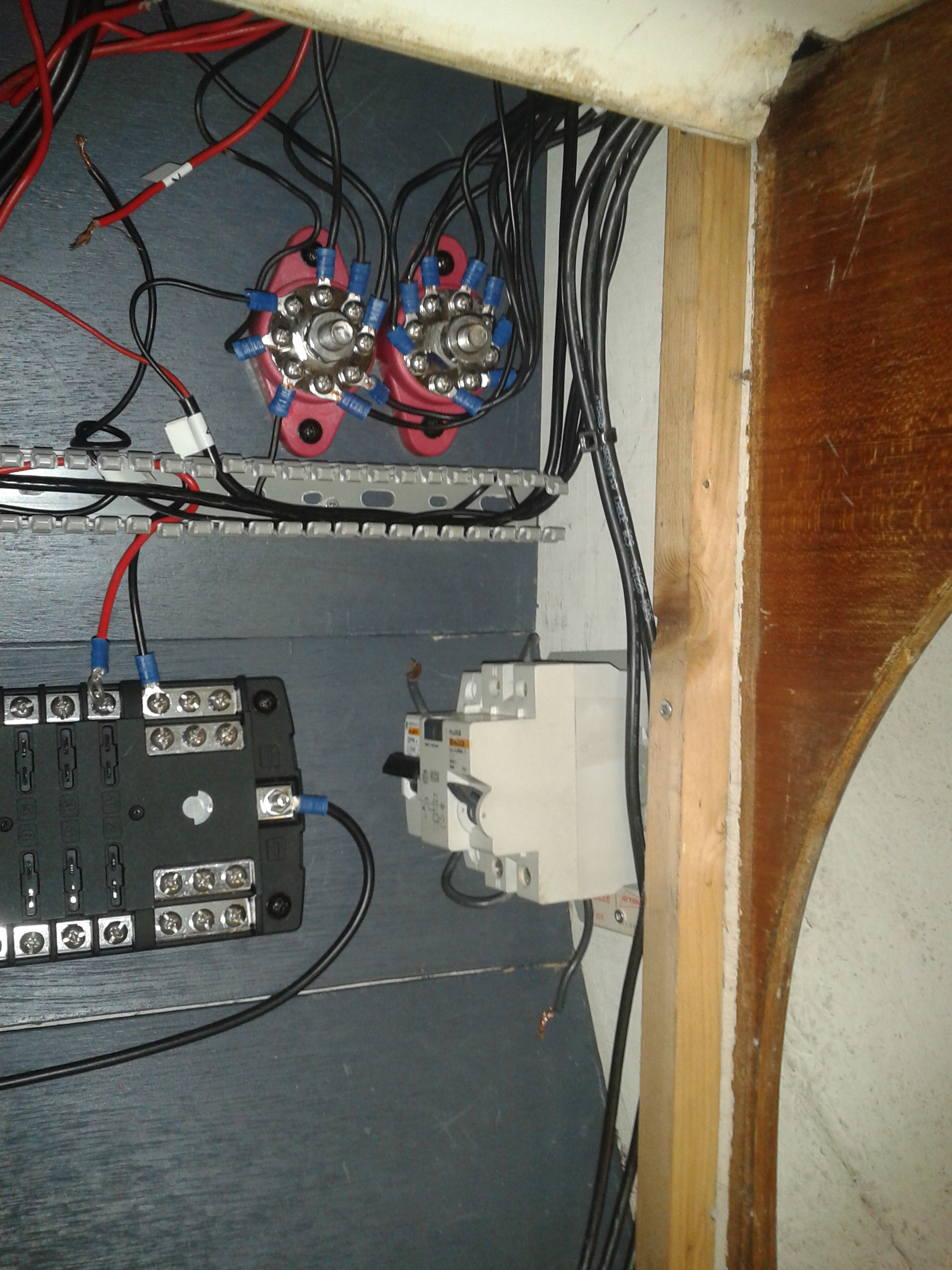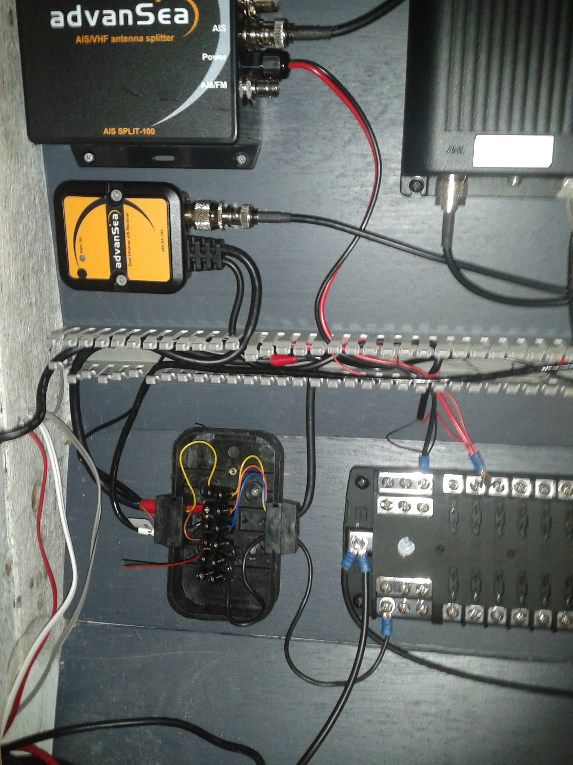 Vandaag de schakelkast kompleet leeg gehaald, ook radio, marifoon en AIS gedemonteerd. De bedoeling is dat straks alles op en in de schakelkast wordt geplaatst. De bedrading die miet kon worden weggenomen heb zoveel mogelijk voorzien van labels. Het hout mee naar huis zodat ik een nieuwe plaat kan gaan zoeken die er zo veel mogelijk op lijkt. Volgende keer nog de bedrading naar de mast identificeren. Op de foto links de ruimte waar de schakelkast zat en rechts de kabelbomen die er straks weer naar toe geleid worden.