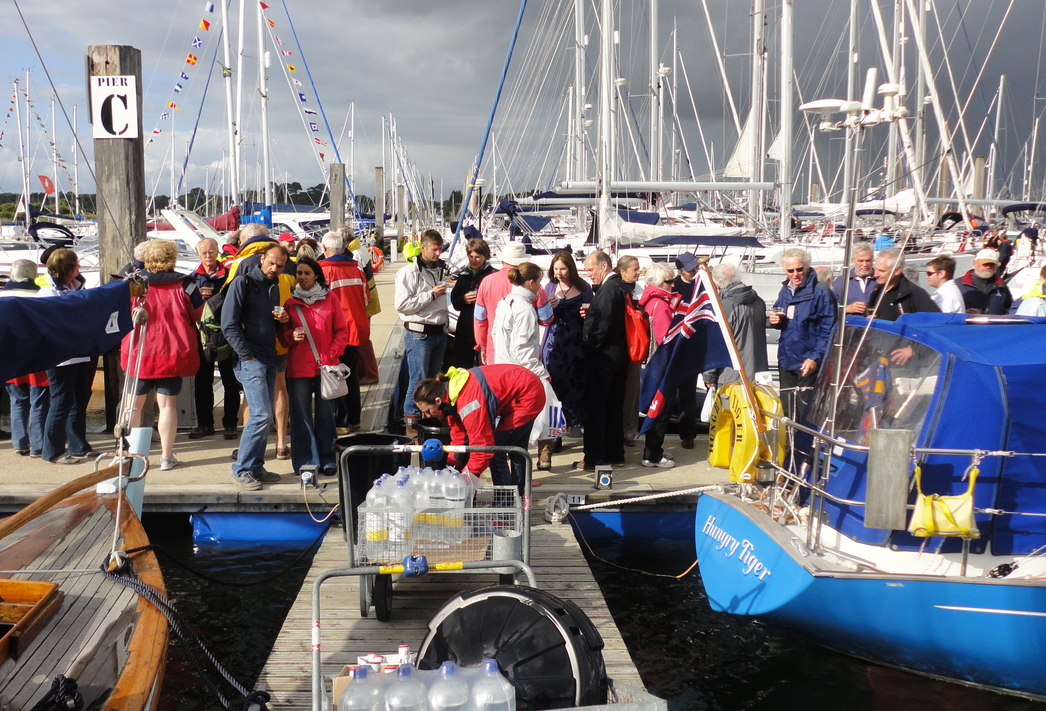 Een mooi schouwspel, vooral omdat er, waarschijnlijk door de vrij harde wind, vrijwel geen andere schepen op het water waren. Aan de wind richting een gele boei voor Keyhaven, daarna bakboord uit richting Yarmouth. Volop gelegenheid voor een professionele fotograaf om mooie plaatjes te schieten van deze gebeurtenis. Het duurde even voordat alle 40 schepen naast elkaar afgemeerd lagen in de haven van Yarmouth. Lunchen in de kuip en natuurlijk volop gelegenheid met de andere bemanningen te praten.