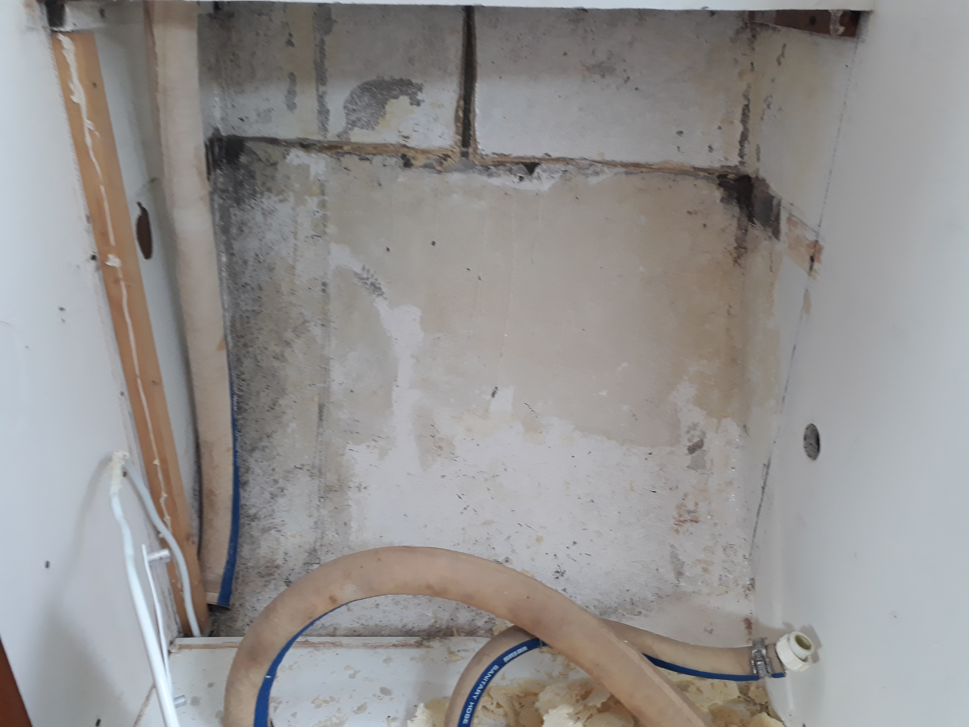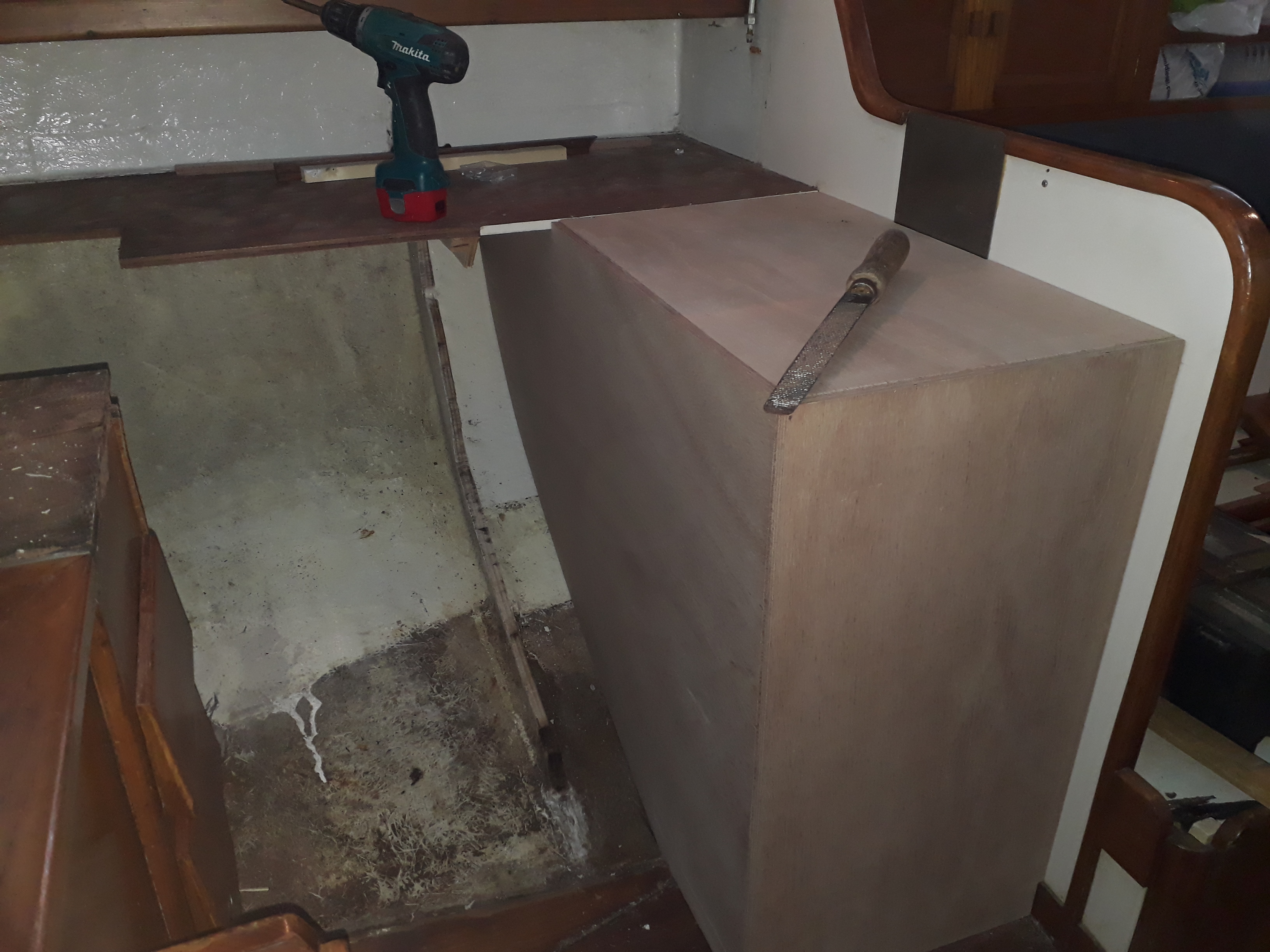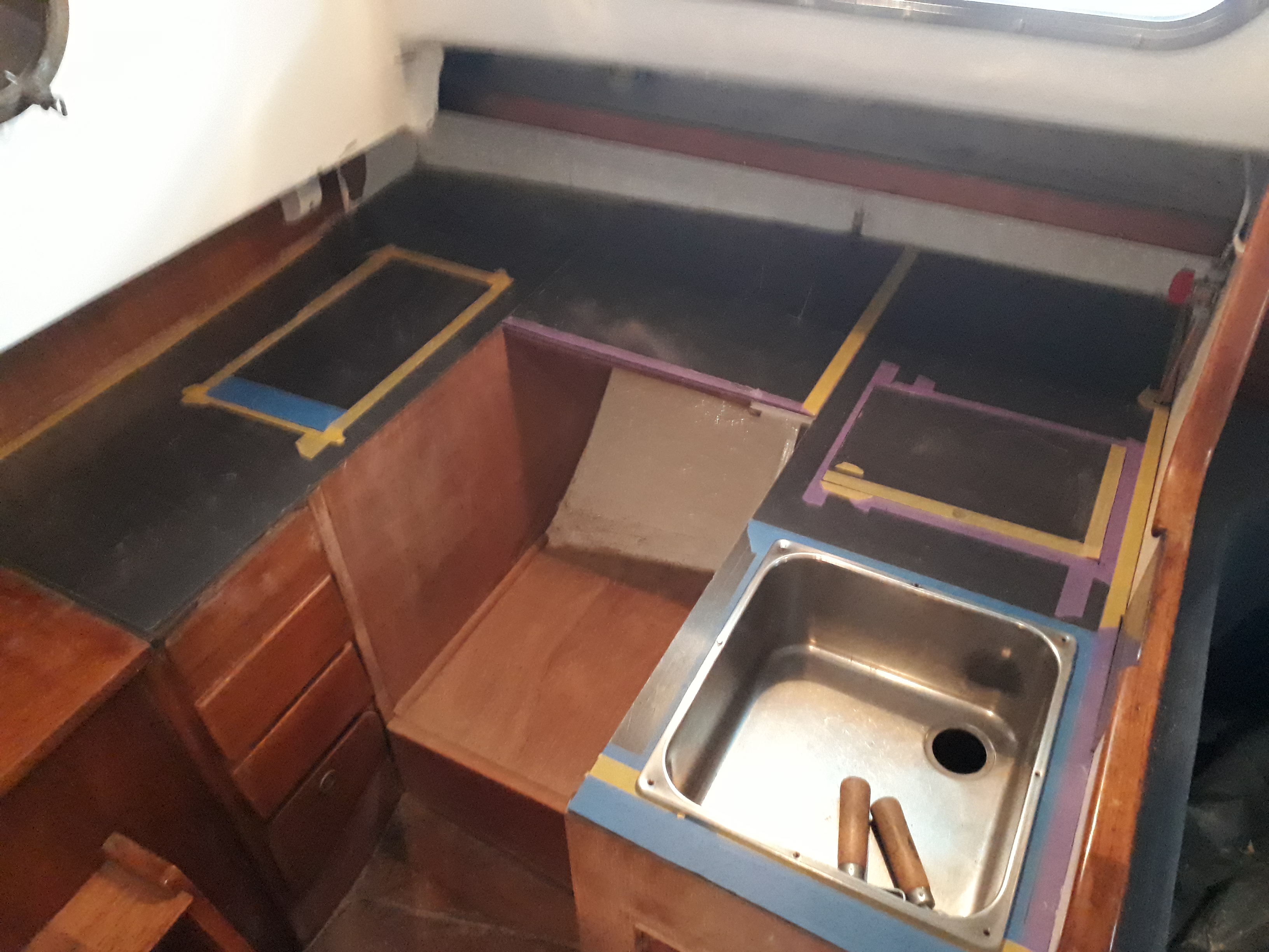 De bestaande ruimte, ooit ook een koelbox, is te voor meerdere flessen wij e.d. Daarom werd het complete bestaande kombuis verwijderd. Een deel van de bovenzijde is gespaard gebleven omdat deze deel uitmaakt van de stevigheid van de romp. Is ingelamineerd. We hebben een grotere koelbox gemaakt van hechthout, eerst voorzien van een laag epoxy en vervolgens enkele lagen DD lak. De compressor is aan de andere zijde van de want geplaatst, met boven de brandstoftank. Deze moest ook iets verplaatst worden. Het brandstof voorfilter zat ook in die ruimte, maar die is verplaatst naar de motorruimte. Daar bleek juist voldoende plaatst te zijn. Beter in het zicht en het is nu gemakkelijker een nieuw filter te plaatsen. De oude polyester bak van de koelruimte hebben we wel benut. Deze zit nu rechts achter het wasbakje. We hebben nu niet alleen een ergonomisch beter kombuis, maar ook meer ruimte.