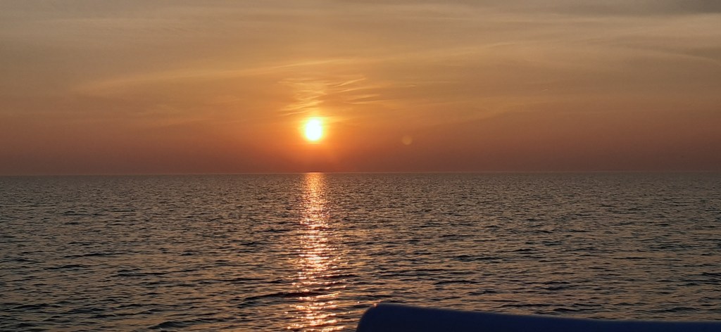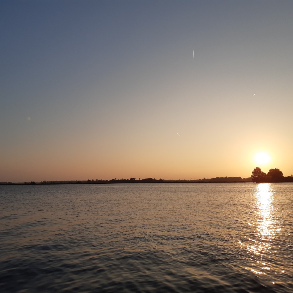 We hadden geen zin om de nachtroute via Amsterdam te nemen, dus via Leiden richting Haarlem in konvooi. Vrijwel alle bruggen draaien vrijwel direct als je aankomt. Aan het einde van de middag lagen we voor de spoorbrug bij de Kaag. Deze zou pas om 19:30 uur open gaan. Omdat we geen haast hadden en het erg rustig weer was besloten we iets terug te varen en voor anker te gaan achter één van de eilandjes. Zwemmen en de waterlijn schoon maken. Erg mooie zonsondergang. Helaas deze mooie vrijdagavond betekende ook een diskobootje met jeugd en harde muziek, die tot na 10uur naast ons afmeerde. Daarna weer rust!