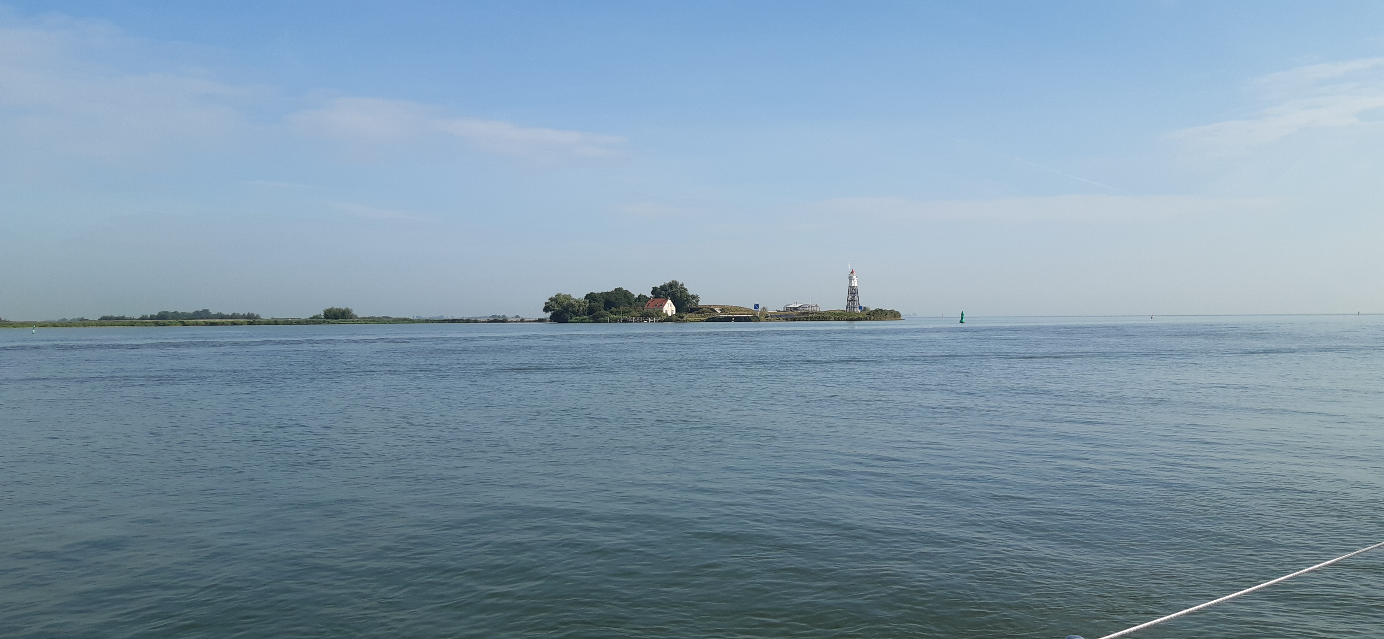 Toen we het Markermeer opvoeren kwam er een klein beetje wind uit de goede richting (O), maar na enige tijd viel deze weer geheel weg en moesten we de motor starten. na een uurtje keerde de wind weer terug, maar meer noordelijk, dus moesten we kruisen. Daardoor arriveerden wij vrij laat bij deze nieuwe eilanden en was de haven al meer dan vol. Omdat het toch nog mooi weer was besloten we weer voor anker te gaan die nacht.