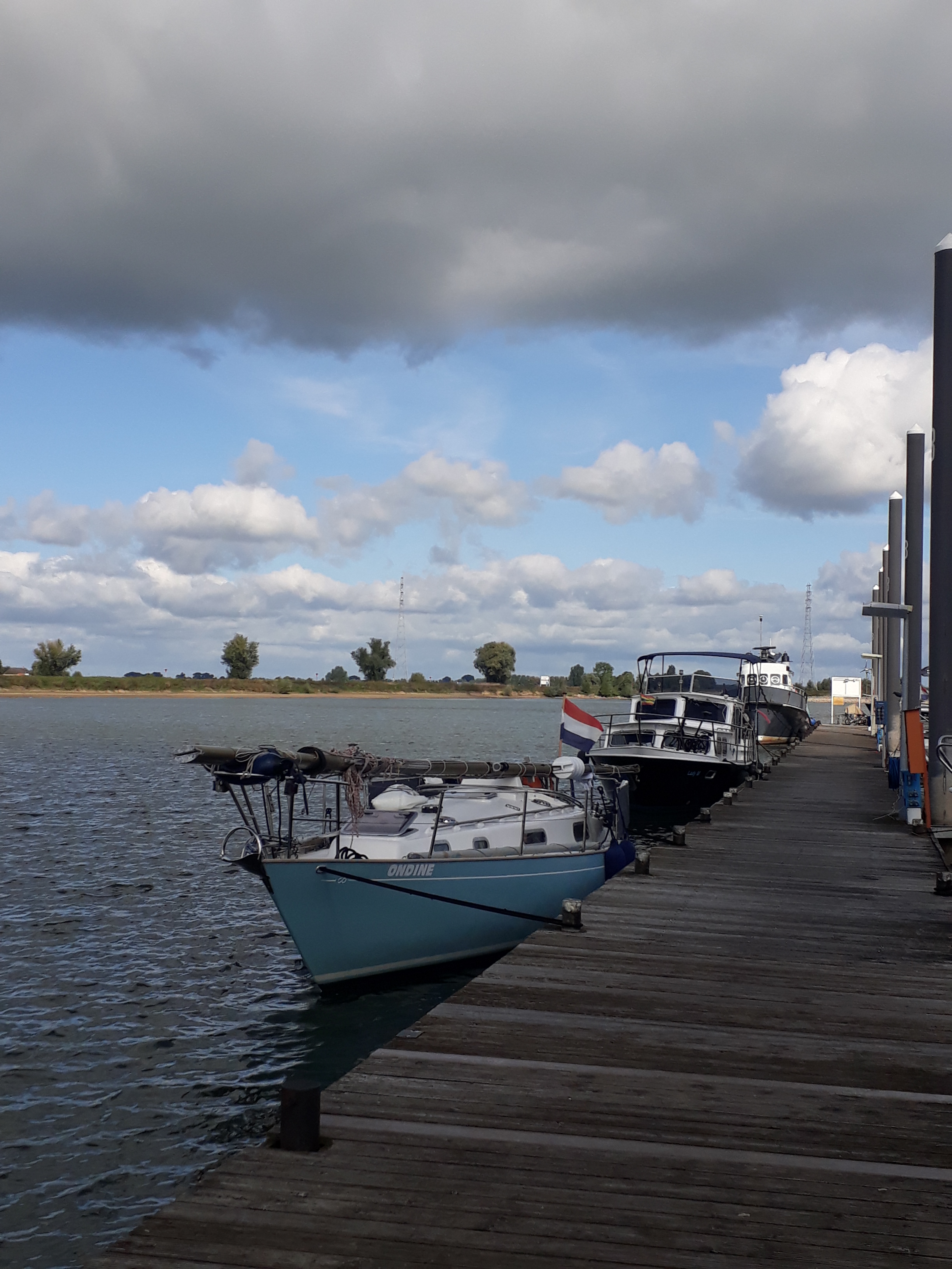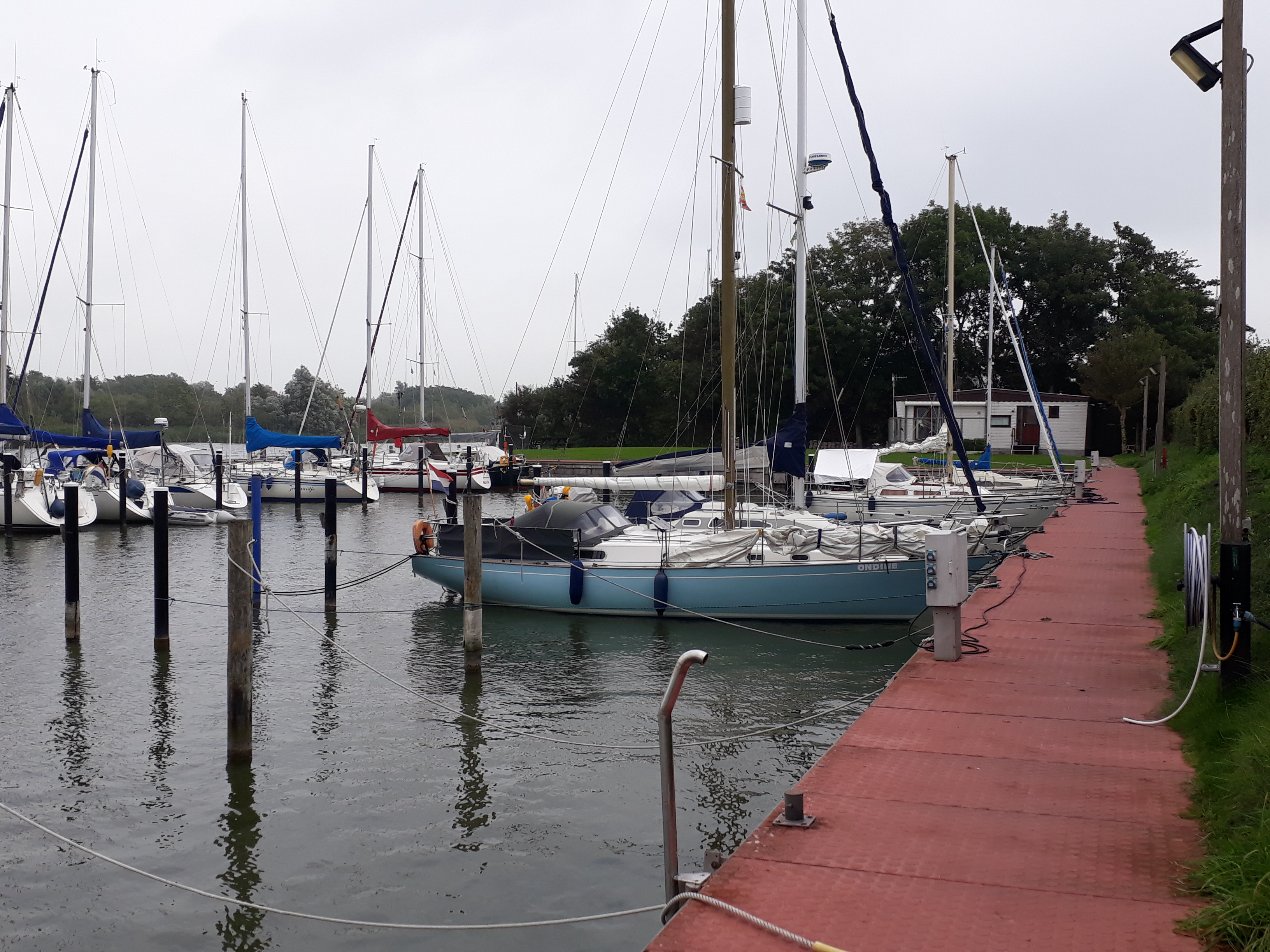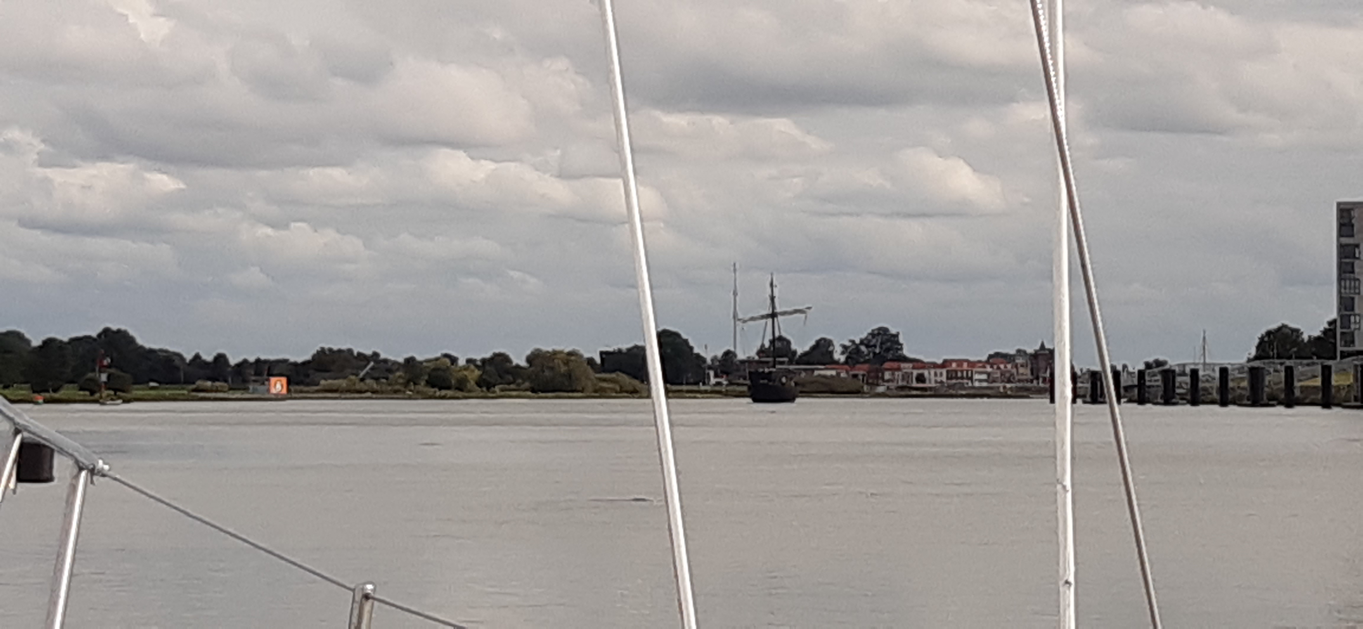 `s morgens om half tien de mast gestreken door een zeer aardige behulpzame havenmeester. De mast bevestigd op de preek/ en hekstoel en verder de rivier op. In eerste instantie was de planning in Wijhe te overnachten, maar daar aangekomen bleek dat een erg klein haventje en met 2 meter mast achter de boot durfden we daar niet in te manoeuvreren. Aan de loswal met mogelijke deining van de beroepsvaart zagen we ook niet zitten. Dan maar door naar Olst, maar na enige tijd zagen we een bord naar een jachthaven aan de rechteroever waar we niet van op de hoogte waren. Dat bleek de Kozakkenhaven van Veessen te zijn. Een langere insteekhaven en rustig. Wat een geruststelling, vooral omdat we bang waren dat Olst ook geen goede keus zou zijn. Restaurant was weer gesloten, maar de volgende dag konden we wel vers brood kopen.