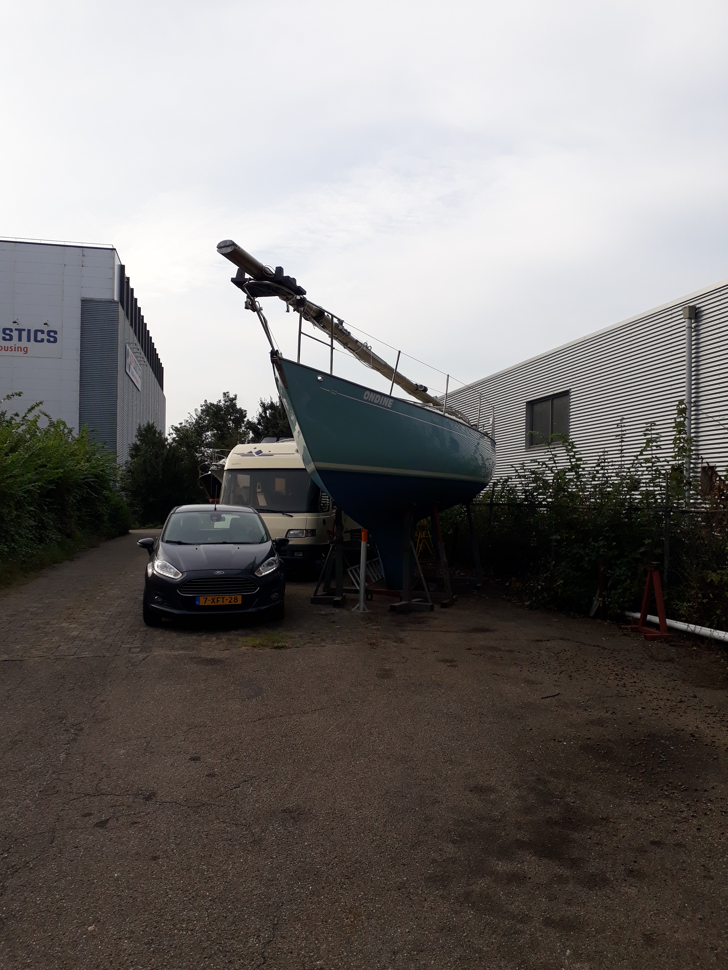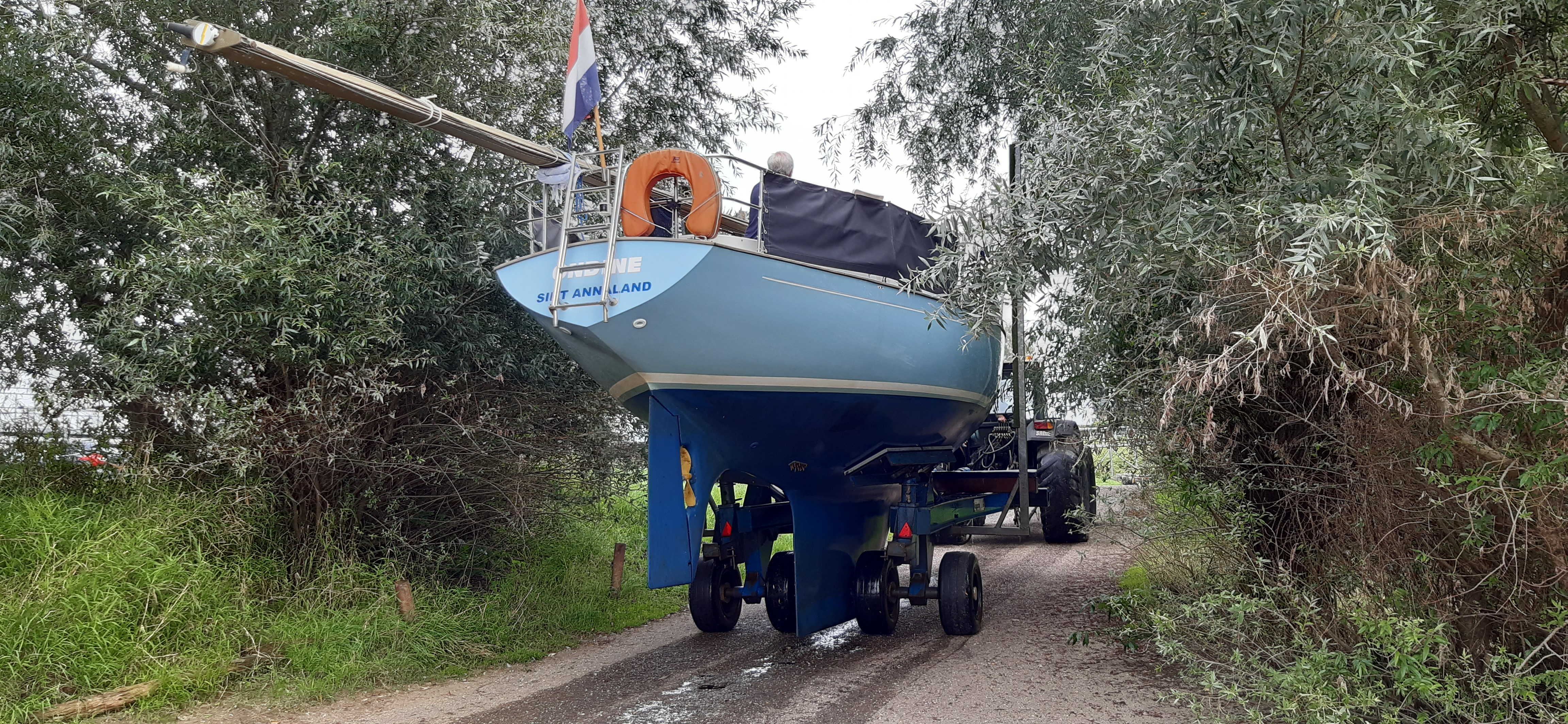 Vroeg in de middag, volgens afspraak, verschijnt de tractor met de botenwagen. Voor mij de eerste keer dat de boot op deze manier uit het water gaat, dus best wel even spannend. Het is windstil dus het manoeuvreren tussen de palen gaat goed. De boot wordt hydraulisch opgetild en gestabiliseerd aan de achterkant. aan de voorkant rust ze met de boeg op een balk. Op de voorlopige eindbestemming voor de loods afgespoten en daarna op de definitieve winterplaats op de bok geplaatst.